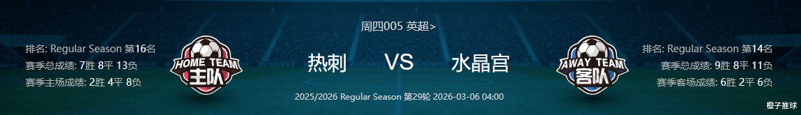 看法:双方近10次交锋中,热刺取得6胜3平1负的压倒性优势,但水晶宫在2023年客场曾逼平热刺,展现出战术执行力。再从近期表现来看,热刺近期状态极度低迷,主场毫无优势可言,再加上毁灭性伤病潮的影响,阵容残缺、士气低落,很难凭借主场优势拿下胜利;水晶宫虽然也有主力缺阵,但整体阵容相对完整,客场作战能力不俗,防守韧性十足,反击战术成熟,即便攻击线受损,仍有能力与热刺周旋,面对如此情况的热刺,个人认为作客有望保持不败。