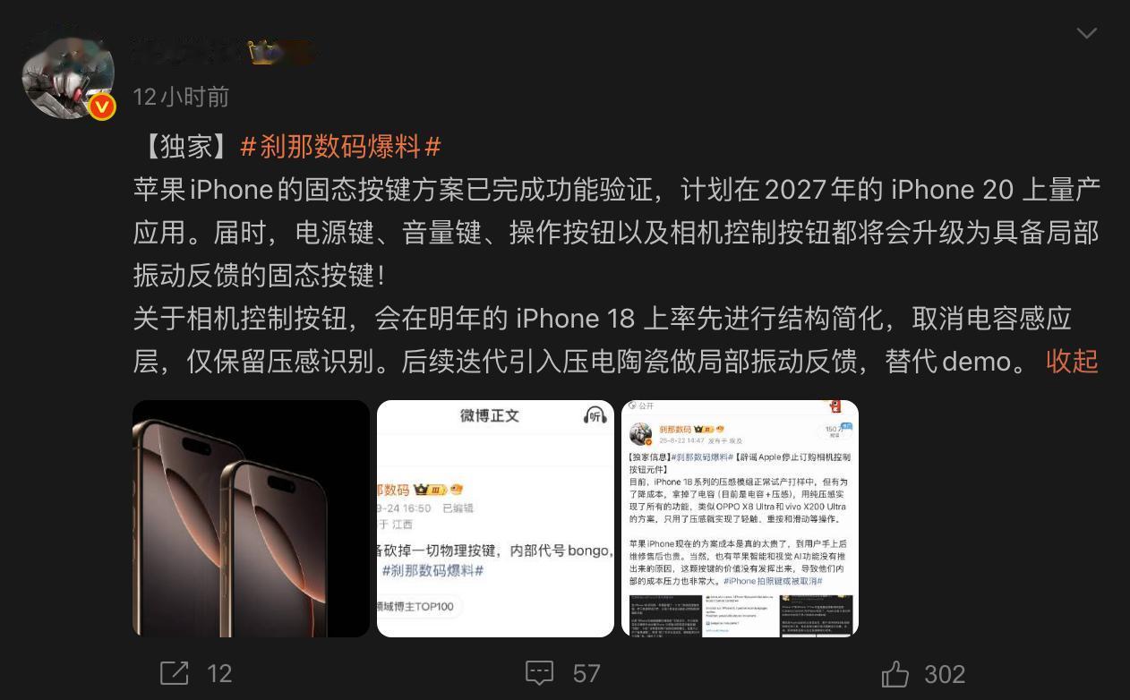 最新的爆料来自博主 @ 刹那数码,消息称苹果计划在 2027 年推出的 iPhone 20 上首次应用固态按键技术。届时,电源键、音量键、操作按钮以及相机控制按钮均会升级为具备局部振动反馈的固态按键。