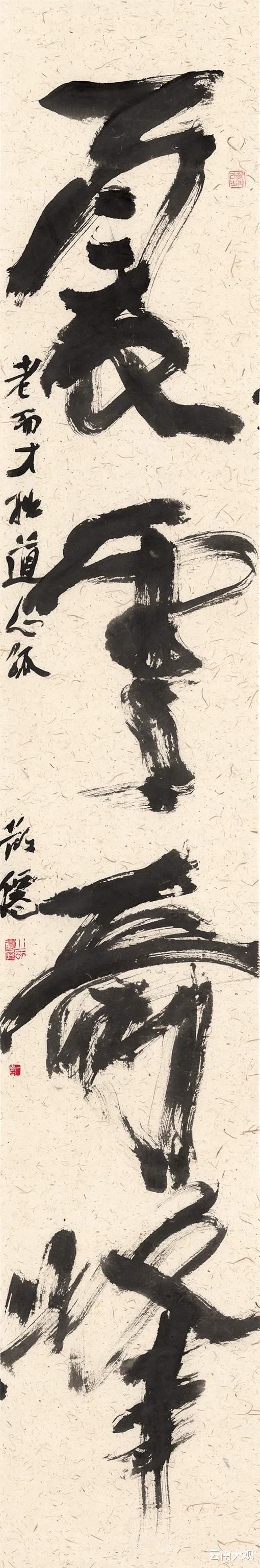 “老夫悟得长锥术,但让前贤一二分”是一句大话,但我让前人不让今人,说到自己的作品,一壶山人认为自己有此“夏云奇峰”一件,便能够呈现自己在书道上的所得了。这位生于四川夹江、长于青衣江畔的艺术家,早年师从乌尤寺遍能和尚、李农罕先生习书,而立之后又随裔敬亭、汪济时先生研学诗画古文。《西昌市志》记载:“周德华、温原兴于1981年在西昌 市二小创办《华兴》书法讲习班”,四十五年过去了,壶公回忆在那之前,自己曾利用等着接儿子放学的空档,用特制的铁笔,在沙地“画沙”。