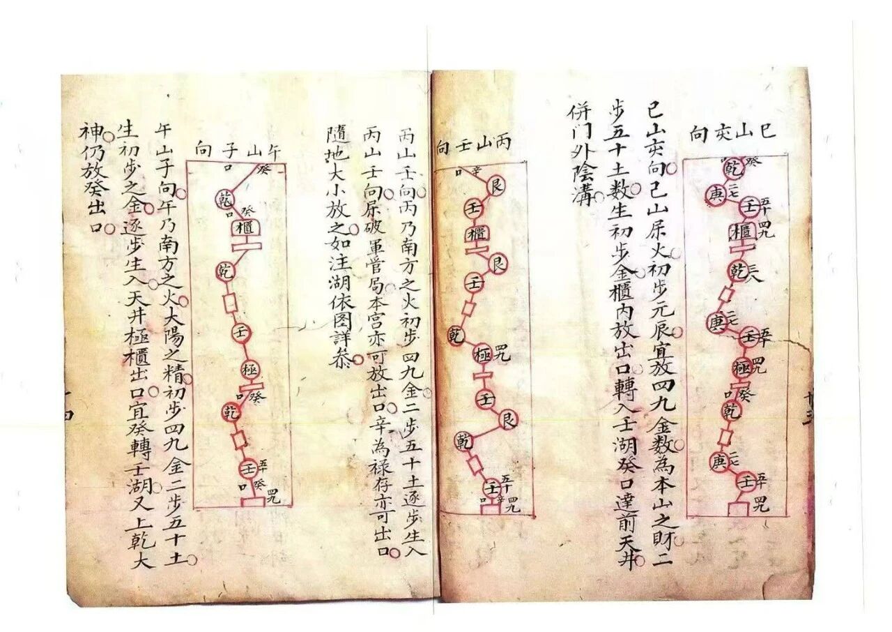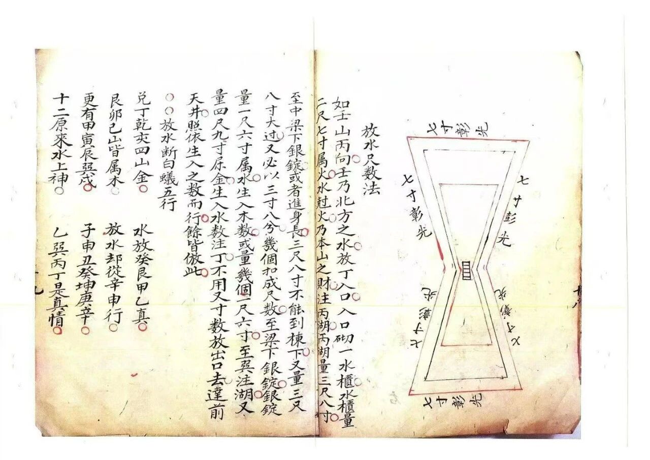 在传统阳宅风水中,天井放水堪称“家宅兴衰之关键”,水流的走向、方位、尺寸直接关乎宅运与家人安康,而三僚村的放水技艺因世代传承宫廷与民间实操经验,历来被奉为风水界圭臬。这部《三僚秘传阳宅天井放水图》38筒子页(76页)内容,精准构建起“理论口诀-图文解析-实操规范”的完整知识体系,将复杂的放水技艺拆解为易懂的实操指南。理论根基层面,收录玉尺口诀、水道说、三神注说、宗庙水法诀尺寸参用等核心内容,其中玉尺口诀详细说明风水专用测量器具“玉尺”的校准与使用方法,为放水方位与尺寸的精准判定提供核心依据;三神注说则解析乾坤艮巽等大神、甲庚丙壬等中神、乙辛丁癸等小神的放水流转逻辑,明确“小神入中神、中神入大神”的趋吉原则,尽显三僚水法的严谨性。