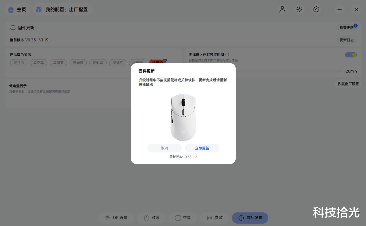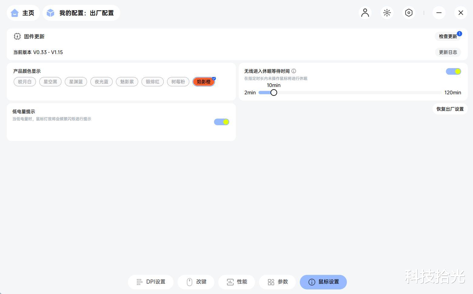 其实鼠标的颜色和无线模式等待时长可以提前设置,设置好后驱动页就会显示准确的产品颜色了。