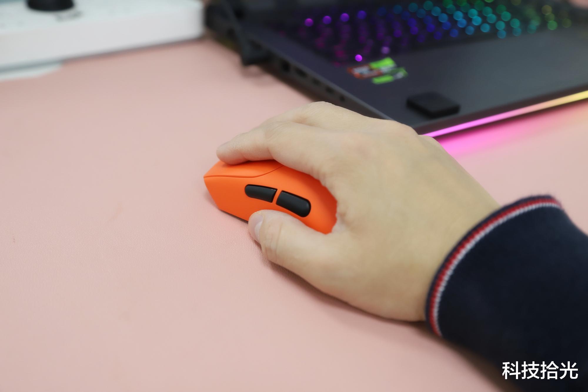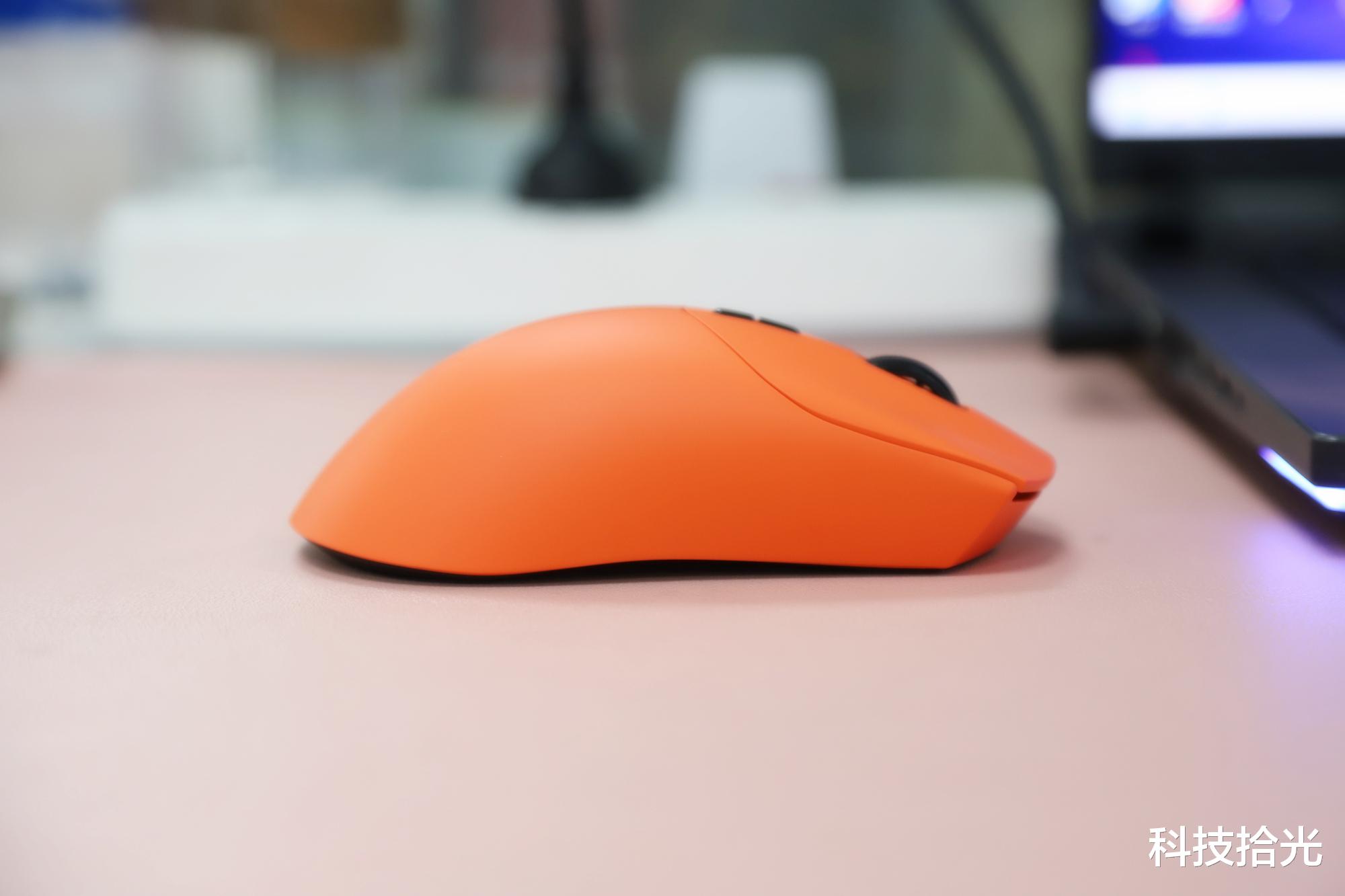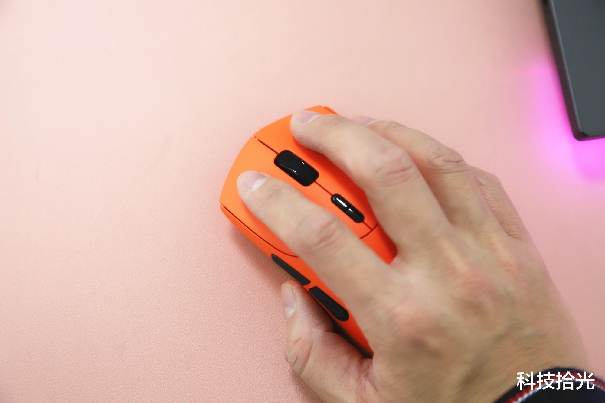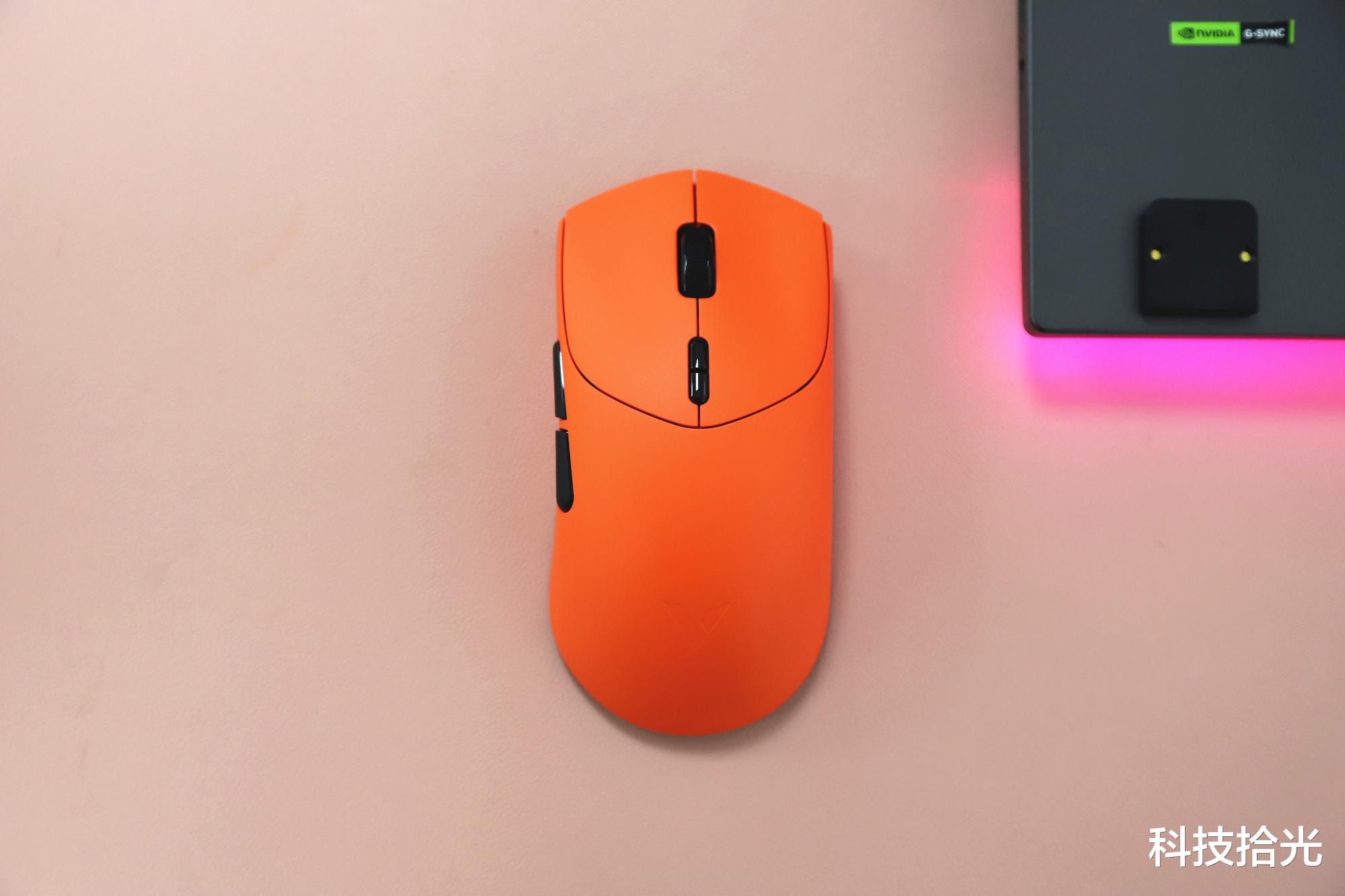而焰影橙色款的雷柏VT7二代也确实够正也够靓。这款鼠标采用了右手设计,造型类似毒蝰,可以为右手玩家提供更好的手感。机身尺寸为127*64*40mm,适配19-21cm的中大手型,堪称“多握法万金油”。