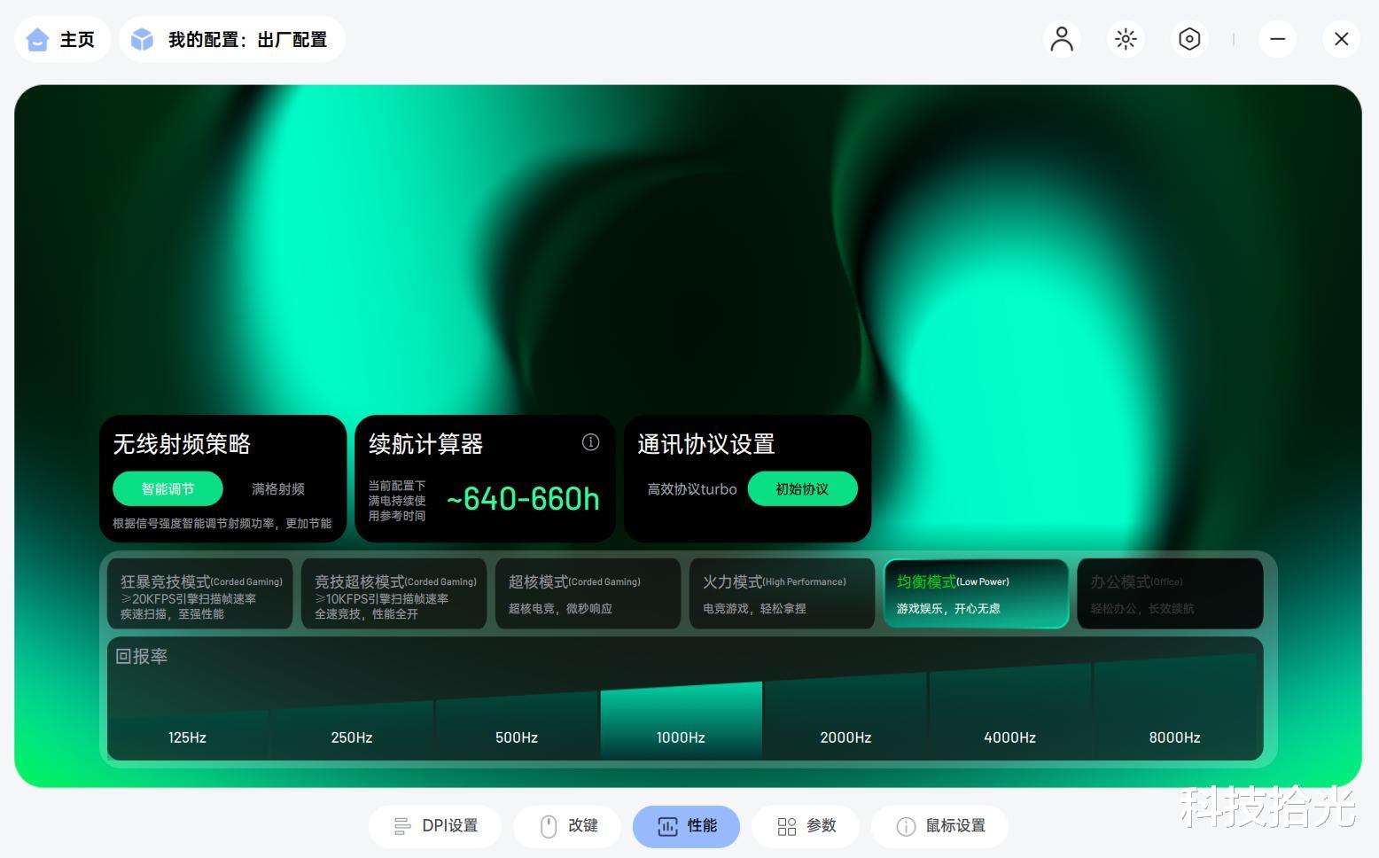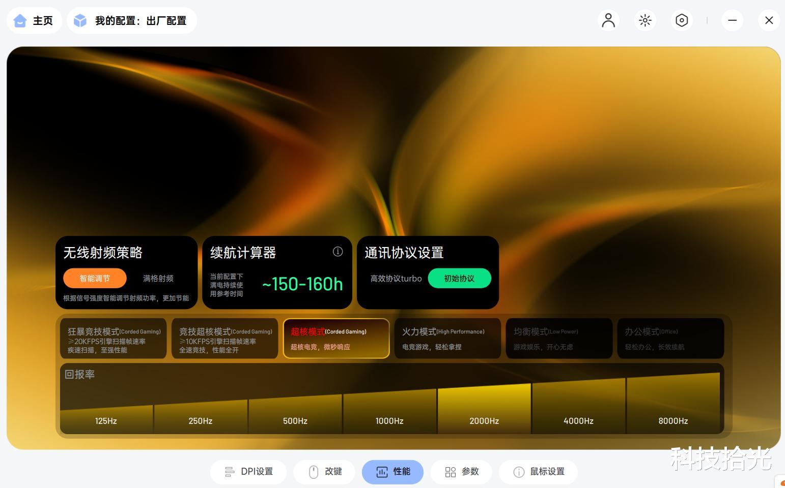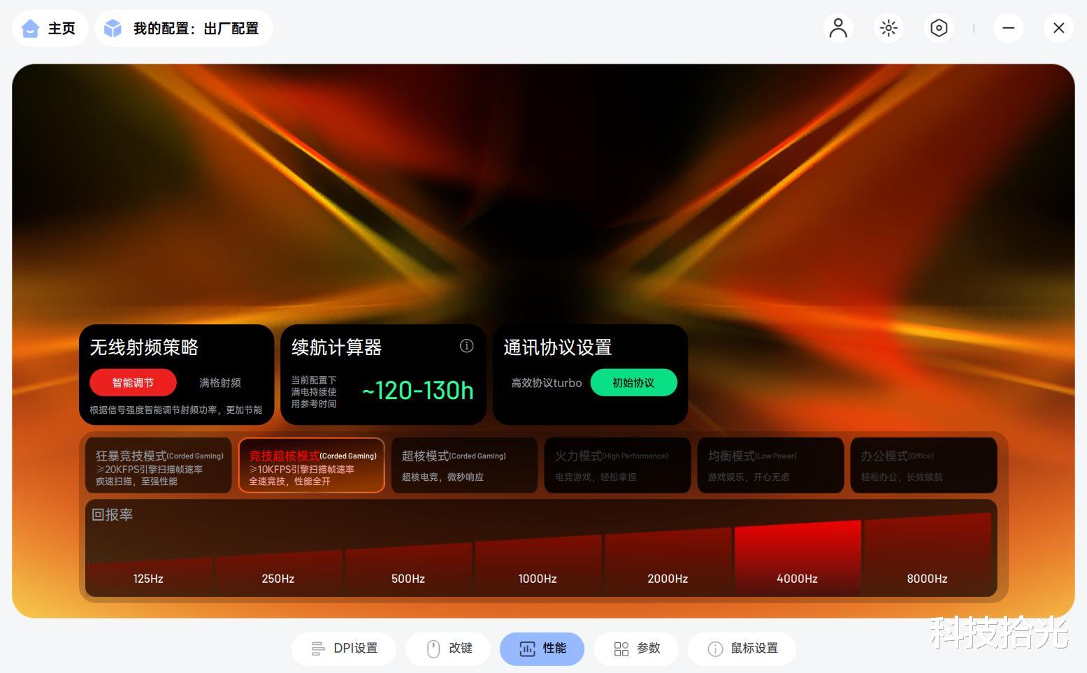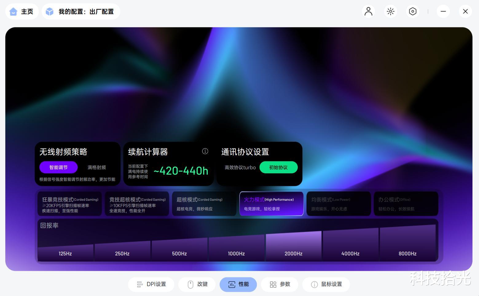 越高的性能选项,背景的配色会更加的炽热。比如超核模式可以选2KHz,续航约150小时。其实这个模式已经足以畅玩大部分游戏了。