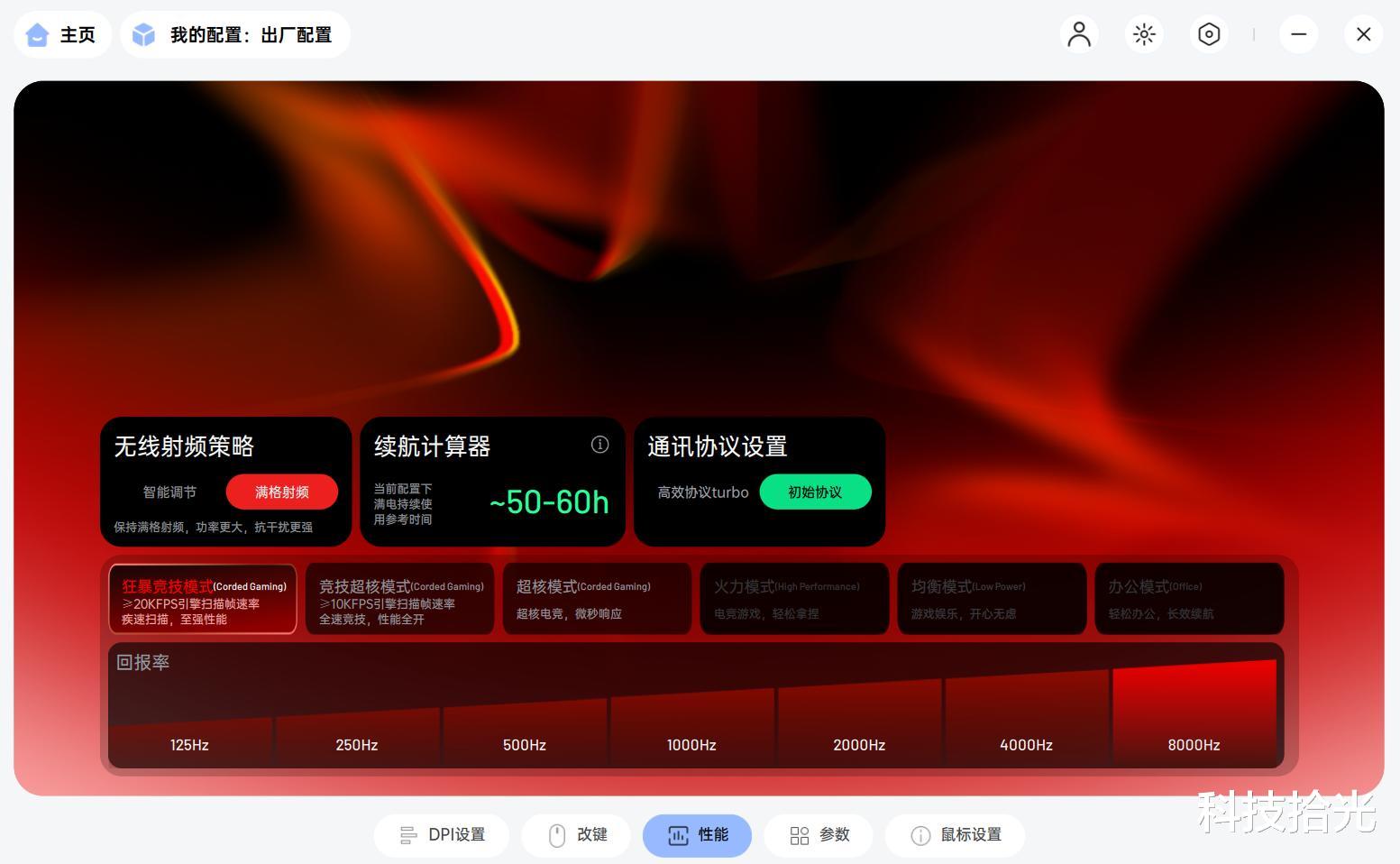 狂暴竞技模式为暗红色,颜色非常炸眼,能量感爆棚。搭配满格射频模式,续航约50~60小时,选择次模式也足以应对一整天的游戏比赛。而8K模式下鼠标会有极强的追手感,可以再次提升玩家的手感和状态,专业电竞玩家推荐选择此档位!