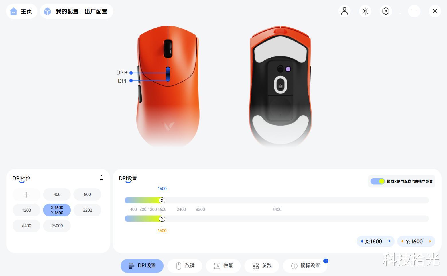 可以在DPI设置页进行快速档位设置,另外还可以开启XY轴的单独DPI设置,这对于高端进阶的FPS玩家来说,会非常有用。