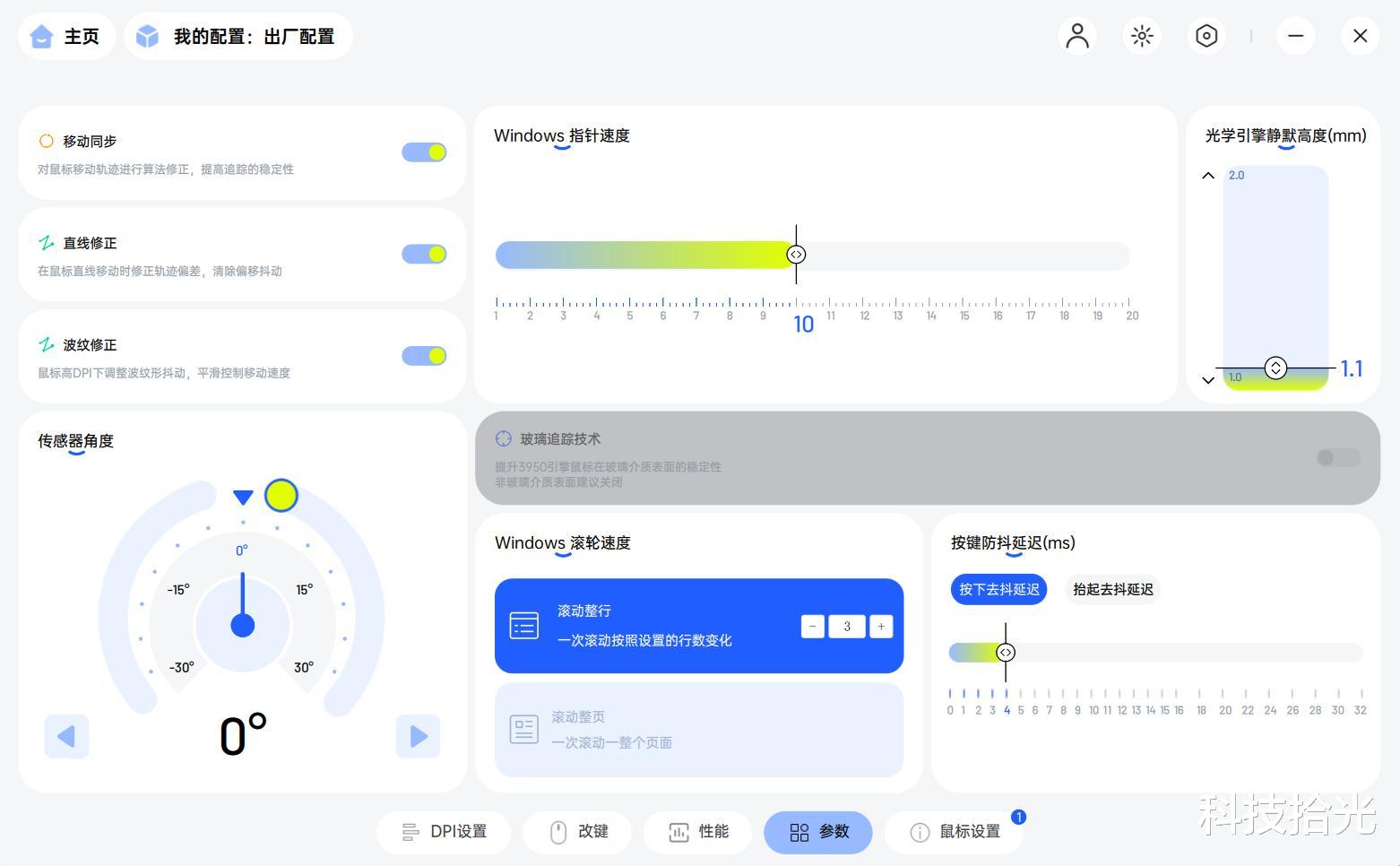 在参数设置页,可以进行传感器角度、防抖、滚轮速度、指针速度,甚至玻璃追踪技术(非玻璃表面不建议开启)。其中光学引擎静默高度支持11档LOD静默高度可选,物距高度可调,满足不同玩家在游戏时抬鼠标转身及移动中,传感器与桌面距离同步移动或停止移动,解决指针抖动、虚飘、迟钝等定位问题,在FPS游戏中,尤其是紧张的对战环节,大角度的抬起调整很容易使鼠标指针“发飘”,这但可以通过LOD高度调整得到改善,非常实用。