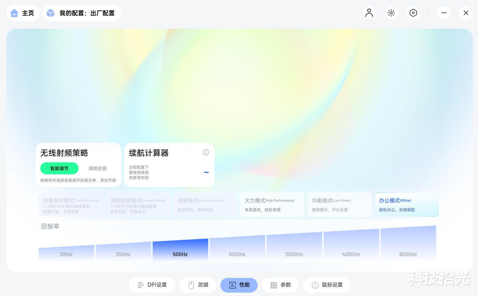 在性能板块,也是下载A hub驱动的精髓,可以针对不同的需求进行不同的性能适配。比如淡蓝色调的办公模式,500Hz,满足办公的精准需求,同时还可以有非常久的续航。