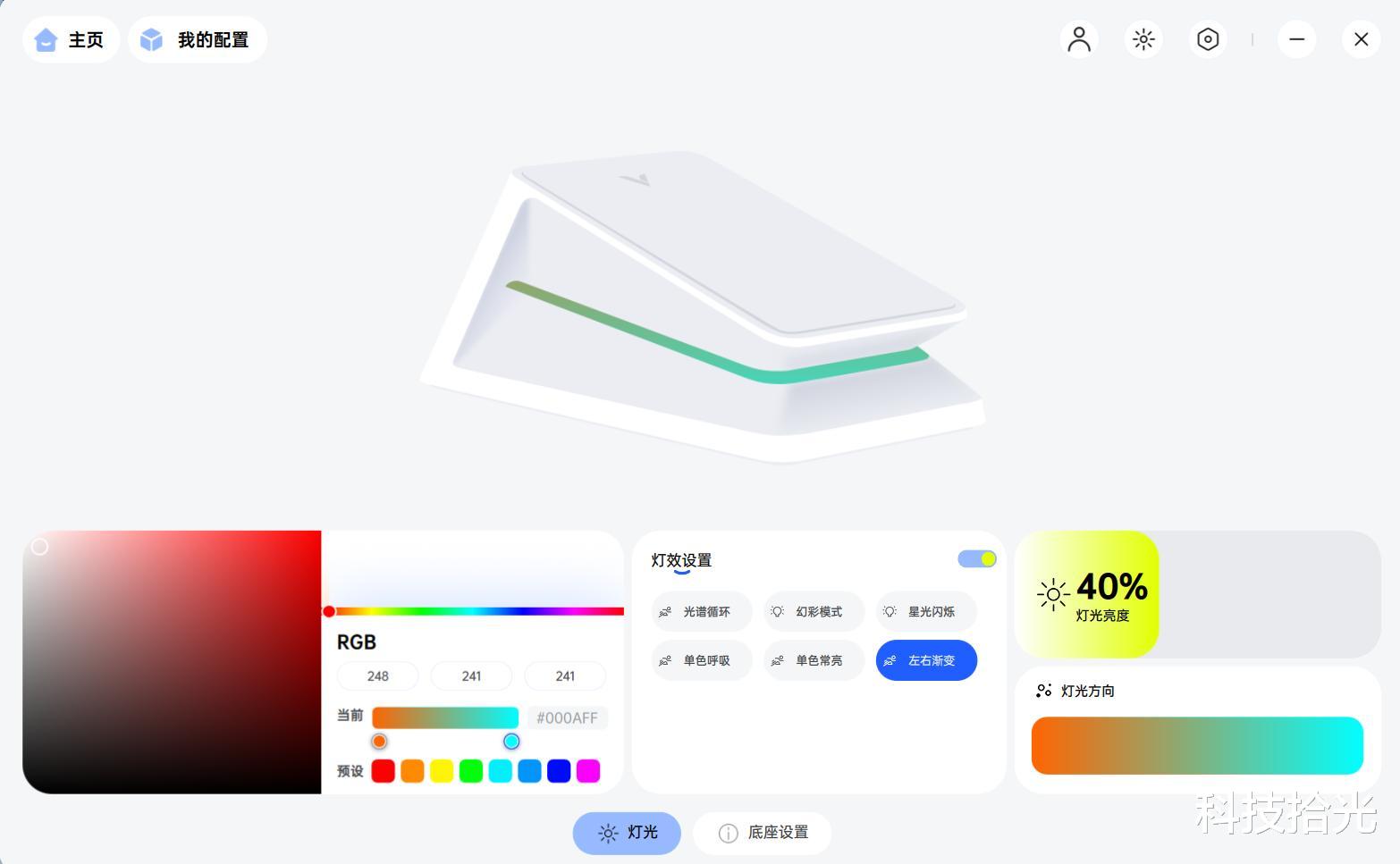打开驱动灯光页,可以看到六种灯效可选,灯光的亮度和方向也都可以对应调整。