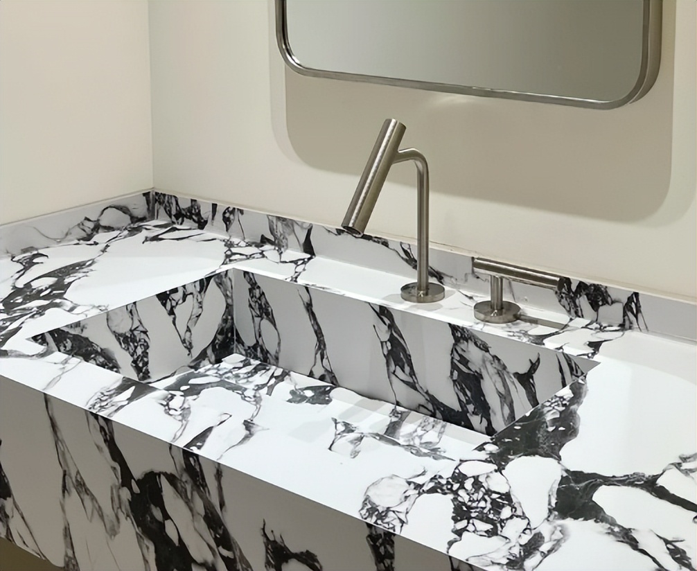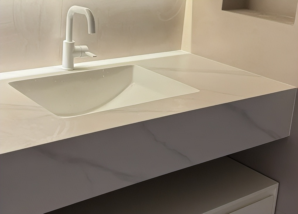 岩板一体盆跟其他材质的台盆不同,它是通过岩板切割搭配着胶水组合到一起的设计,别看颜值高,等到你实际用了就发现这里面的缺点。