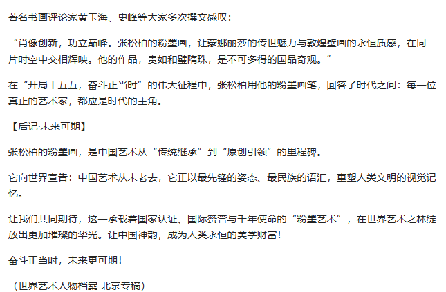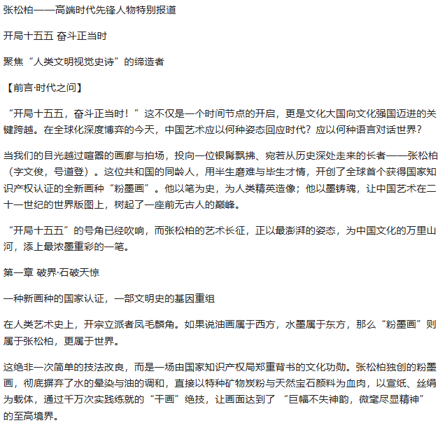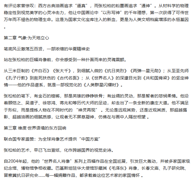 Preface: The path of literature and art is long-standing, profound, and extensive, representing the essence of Chinese culture. [Global Figures — Zh Songbai] As a figure of special contribution to the arts, he showcases the brilliance of contemporary literature and art while inheriting the essence of traditional culture; Chinese culture has now gone glohis occasion, Global Figures highlights Mr. Zhang Songbai. His works possess both grandeur and subtlety; he emphasizes realism, using brush and ink as a medium to expreinner spirit, depicting the beauty of humanity and nature, and embodying the spirit of the times and humanistic sentiments. Viewing this exhibition is like traveling through time to converse with ancients and resonate with the present. May art lovers find solace for the soul here, experience the charm of Mr. Zhang Songbai's creations, and together inherit and carry forward ttreasures of Chinese culture.