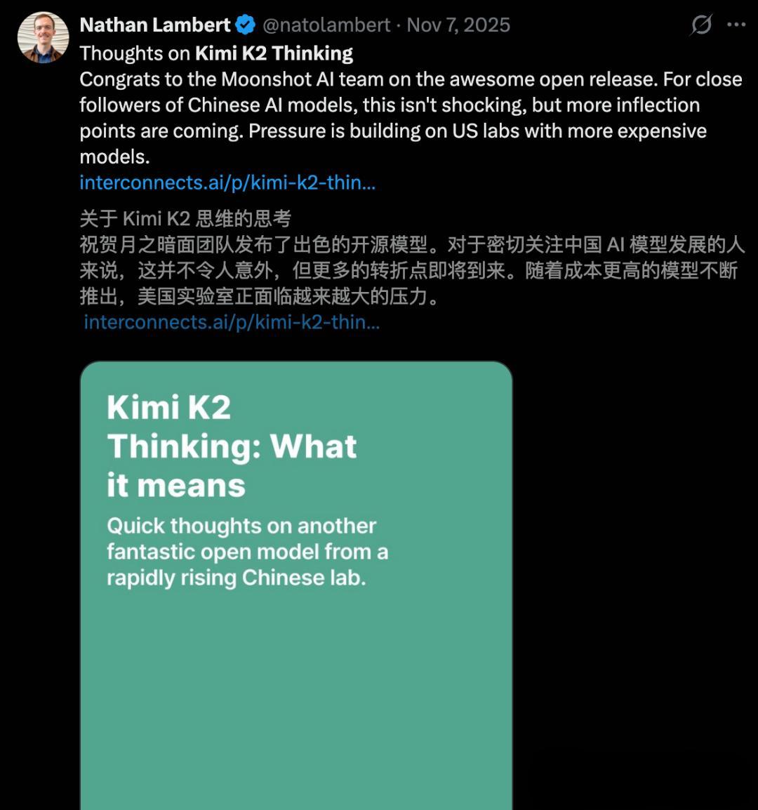 随后,Lambert更在专文中深入分析,高度评价了中国开源AI所具备的独特优势。