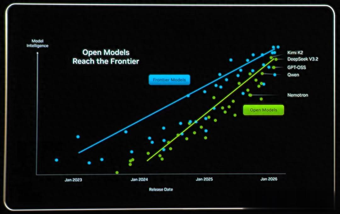 老黄主旨演讲上,中国大模型Kimi K2、DeepSeek V3.2,以及Qwen赫然上屏,位列全球开源大模型前列,性能正在逼近闭源模型。