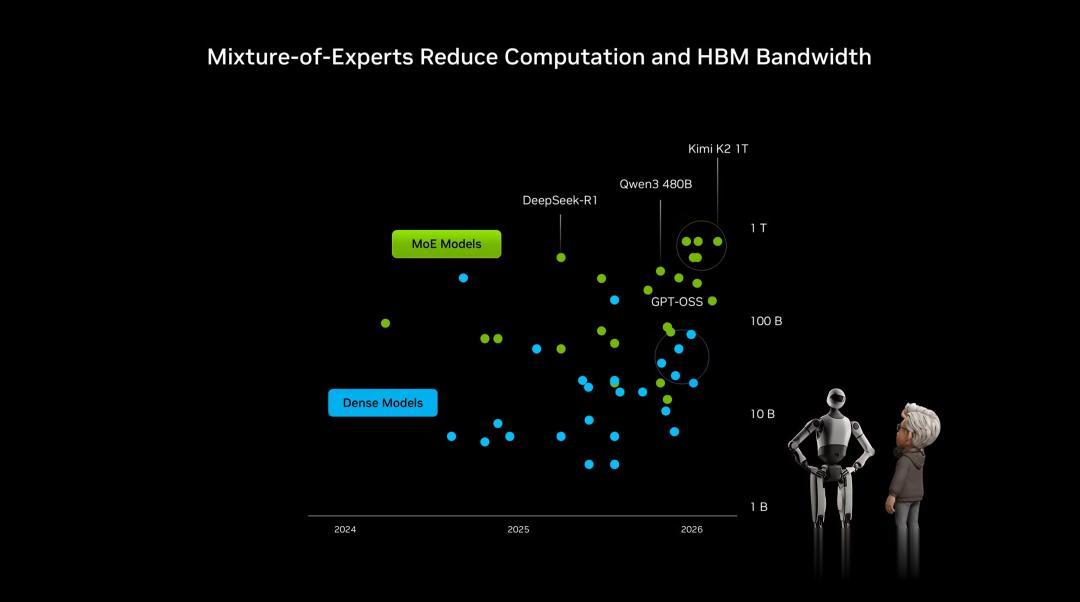 而且,DeepSeek-R1、Qwen3 和 Kimi K2 代表着MoE路线下顶级规模的尝试,仅需激活少量参数,大幅减少计算量和HBM显存带宽的压力。