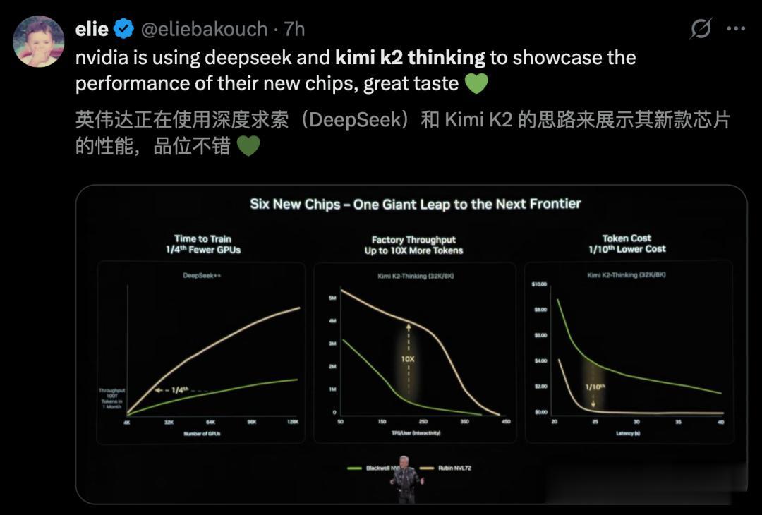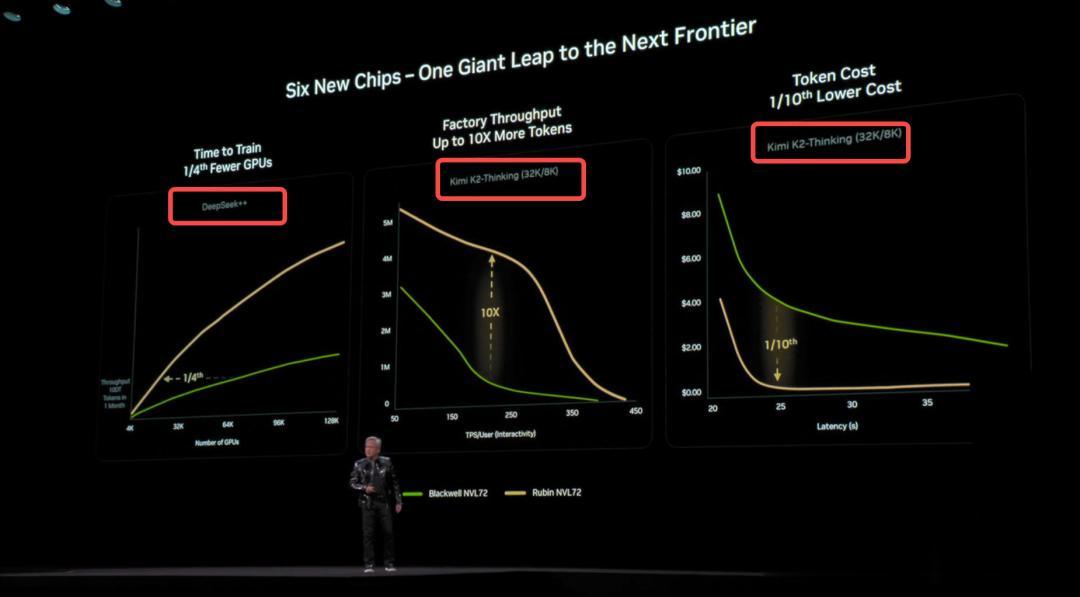 在下一代Rubin架构亮相的核心环节上,老黄还选用了DeepSeek和Kimi K2 Thinking来秀性能。