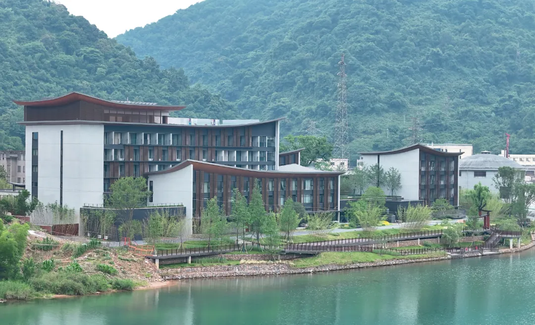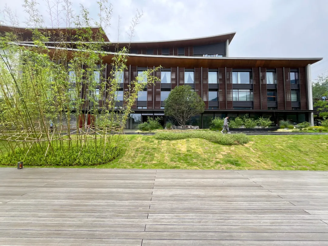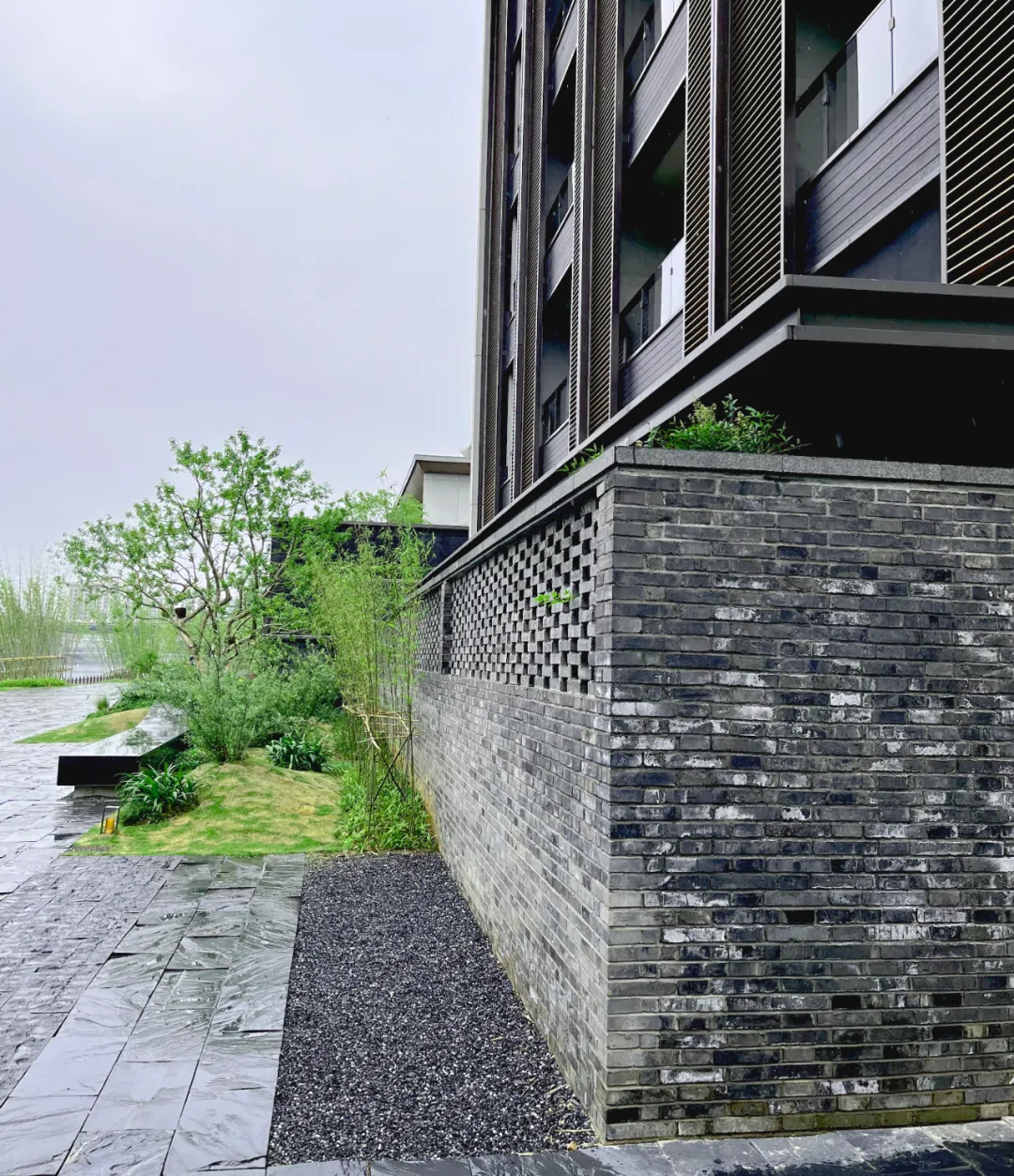 设计取意“湘南水乡”风骨,将传统民居的雕花窗棂、水磨青砖等元素解构重塑,既存古韵又赋新形;格栅式漏窗巧借绿影婆娑,框住四时风光。