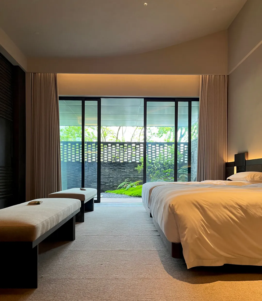 设计以山水为依托,构建「水可鉴心,山能养志」的精神归宿。取材金属格栅、中空玻璃、清水混凝土和当地石材,以「减法设计」凸显材质本真。