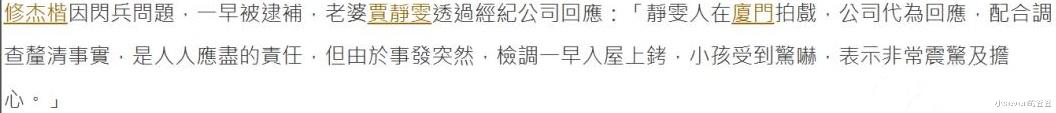 根据网络上曝光的消息,当天执法人员一大早就到贾静雯的家里将修杰楷铐上带走调查,然而身为妻子的贾静雯则还在厦门拍戏。