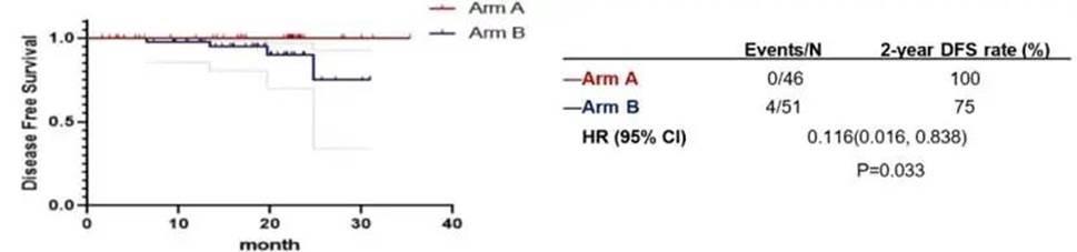 在平均20个月的随访期内,接受靶向治疗的患者没有出现复发现象,而单纯随访的患者中却有4名出现了复发。两组的两年无疾病生存率分别为100%和75%,差异具有统计学意义。