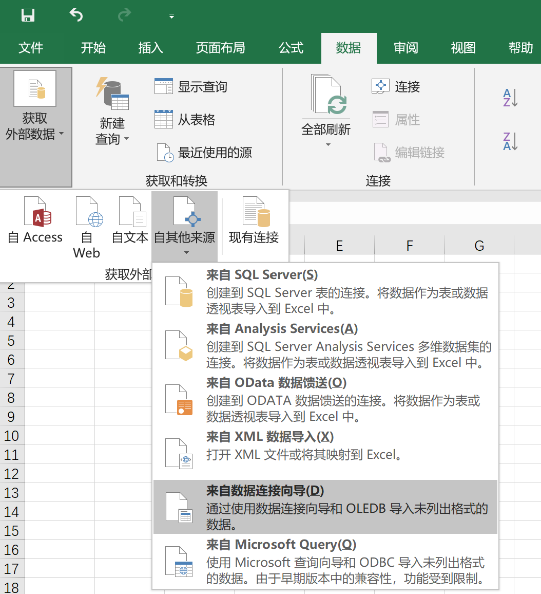 另一个相信大家应该都知道,用的是一个叫ODBC的插件,配置好后,再excel上点击“数据-获取数据-自其他源-从ODBC”。后面再点击高级选项,就可以输入SQL代码了。