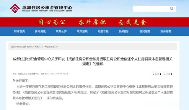 9月25日,成都住房公积金管理中心印发《成都住房公积金按月提取住房公积金偿还个人住房贷款本息管理相关规定》。该规定将从10月8日起实施,有效期为1年。