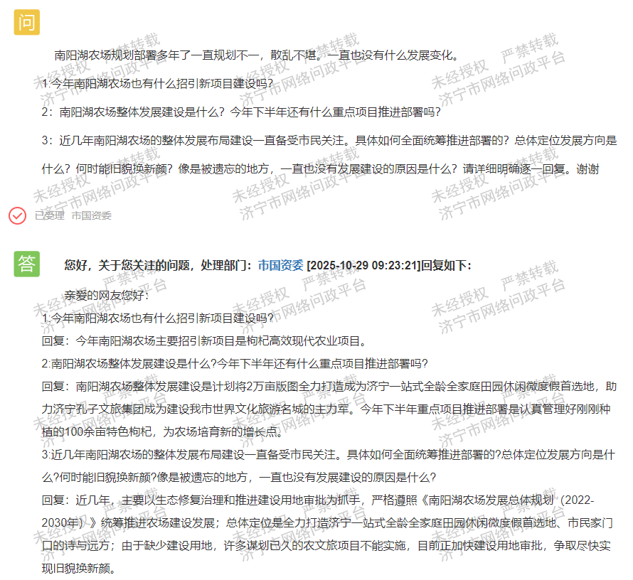 对于网友关注的问题,市国资委回复表示,今年南阳湖农场主要招引新项目是枸杞高效现代农业项目。南阳湖农场整体发展建设是计划将2万亩版图全力打造成为济宁一站式全龄全家庭田园休闲微度假首选地,助力济宁孔子文旅集团成为建设我市世界文化旅游名城的主力军。今年下半年重点项目推进部署是认真管理好刚刚种植的100余亩特色枸杞,为农场培育新的增长点。近几年,主要以生态修复治理和推进建设用地审批为抓手,严格遵照《南阳湖农场发展总体规划(2022-2030年)》统筹推进农场建设发展;总体定位是全力打造济宁一站式全龄全家庭田园休闲微度假首选地、市民家门口的诗与远方;由于缺少建设用地,许多谋划已久的农文旅项目不能实施,目前正加快建设用地审批,争取尽快实现旧貌换新颜。