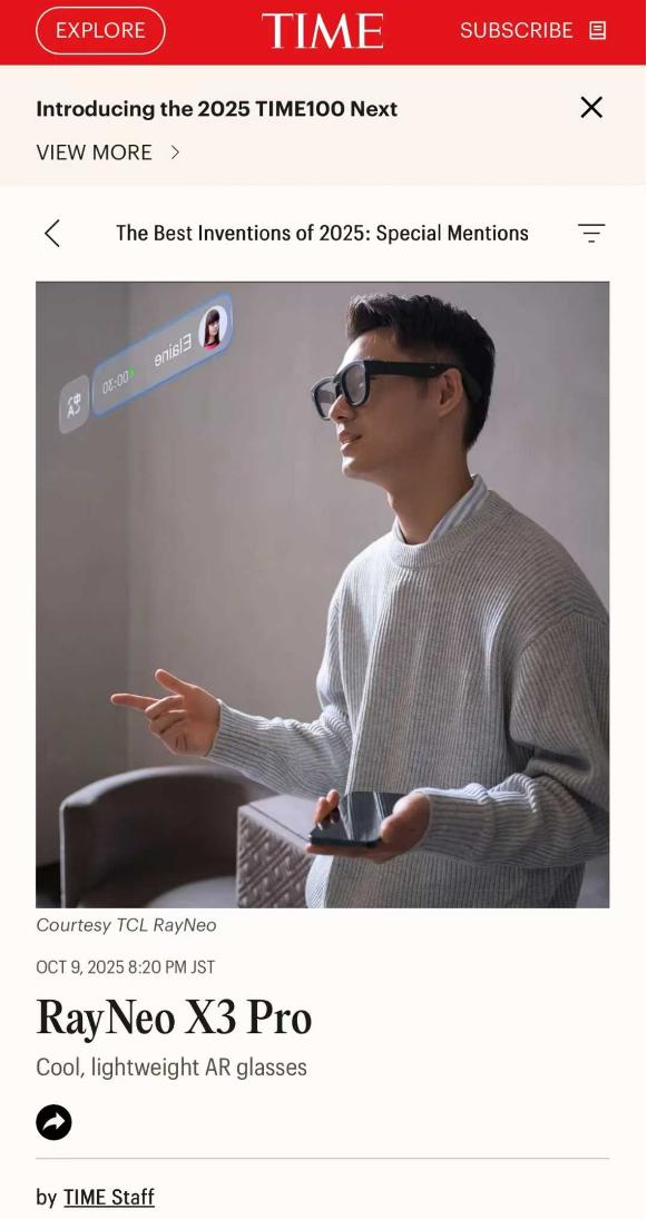 特别是作为拳头产品的雷鸟X3 Pro,凭借着萤火光引擎(全球最小可量产全彩Micro-LED光引擎)、RayNeo光波导(全球首个量产级的光刻刻蚀光波导)和多模态AI等前沿技术,再一次成为AR 眼镜的显示与 AI 交互双标杆产品,并登上《时代》周刊“2025年最佳发明”榜单。
