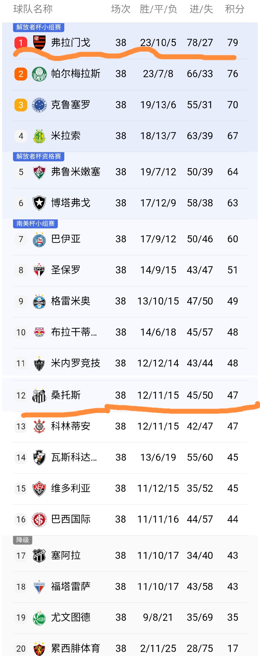 可以看到弗拉门戈积79分斩获冠军,而帕尔梅拉斯以3分之差屈居亚军,克鲁塞罗获得季军。
