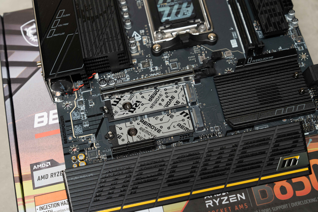 X4短插槽。存储方面,正面提供了三个均覆盖散热铠甲的M.2插槽(其中两个支持PCIe 5.0 x4,一个为PCIe 4.0