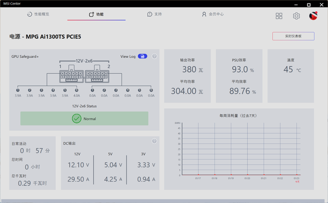 微星MPG Ai1300TS PCIE5 月神电源可以通过MSI CENTER里实时监控电源整体状态,监控实时输出功率、效率以及电源供应器的温度状况。