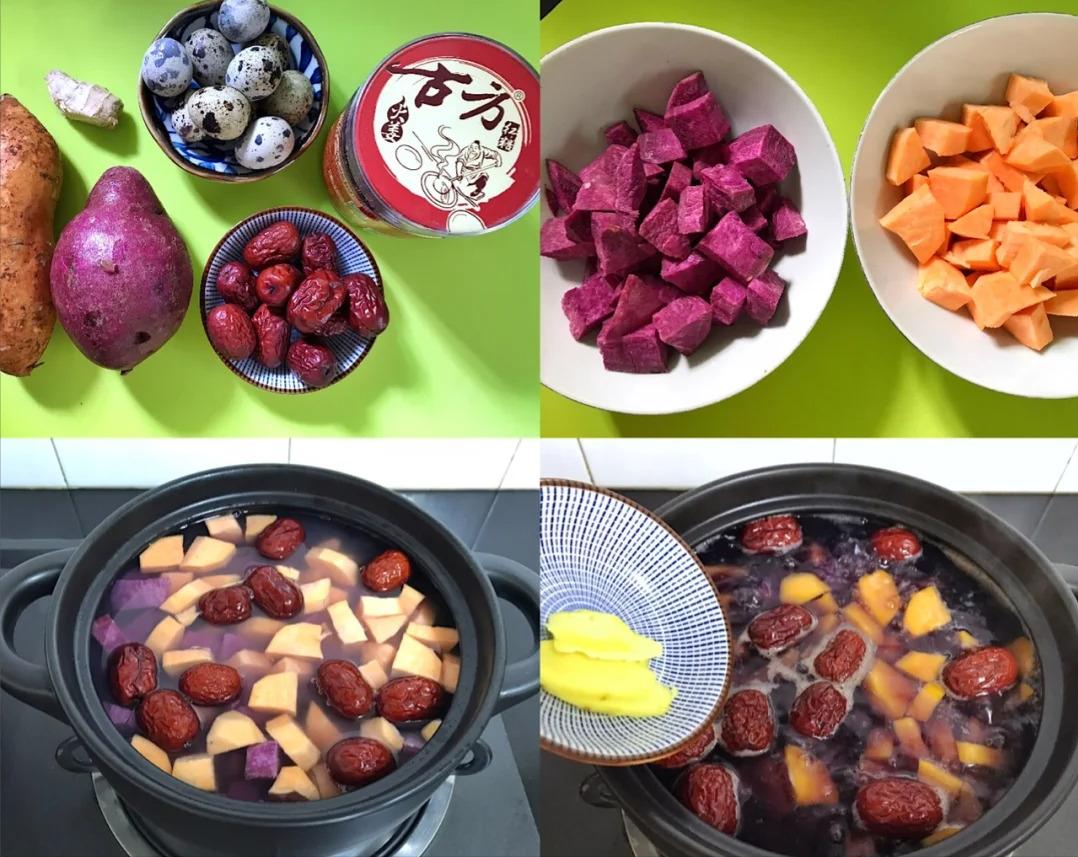 食材:一个红薯、一个紫薯、10 个红枣、10 个鹌鹑蛋、一块老姜、火姜红糖