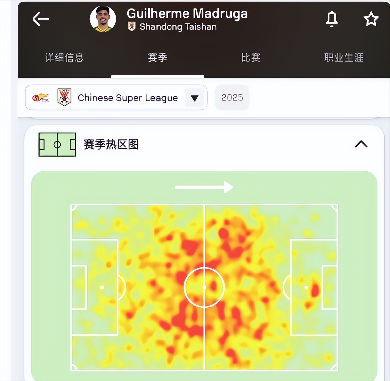 先来看山东泰山外援马德鲁加,他在2025赛季为球队出战28场,首发23场,场均出时间时间75分钟,打入4球,还有1次助攻,场均创造得分机会有4次,场均断球1.3次,场均夺回球权4.4次,场均解围1.3次,但是他丢失球权也很多,那么他与中超同位置球员占优吗?