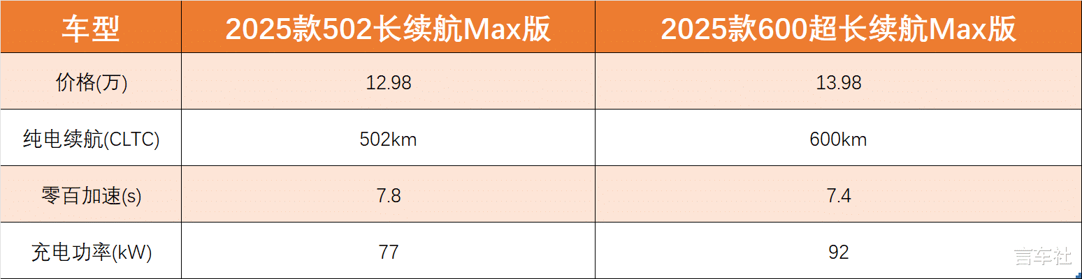 然后就是小鹏MONA M03 2025款600超长续航Max版了,它比自家车型502长续航Max版贵了1万,但配置只多了98km的纯电续航、零百加速从7.8s提升到了7.4s、快充功率从77kW提升到了92kW,其余配置则基本一致。 因此,这1万元预算基本都花在续航上了,从综合配置角度看,其升级的感知强度可能有限。而且和深蓝L06的2026款560Ultra激光版比,它只多了40km的纯电续航,其他方面又和小鹏MONA M03 502长续航Max版基本一致,并未形成明显代差。所以如果您并非极度追求极限续航,那么此版本的性价比相对有限,我真心不推荐。