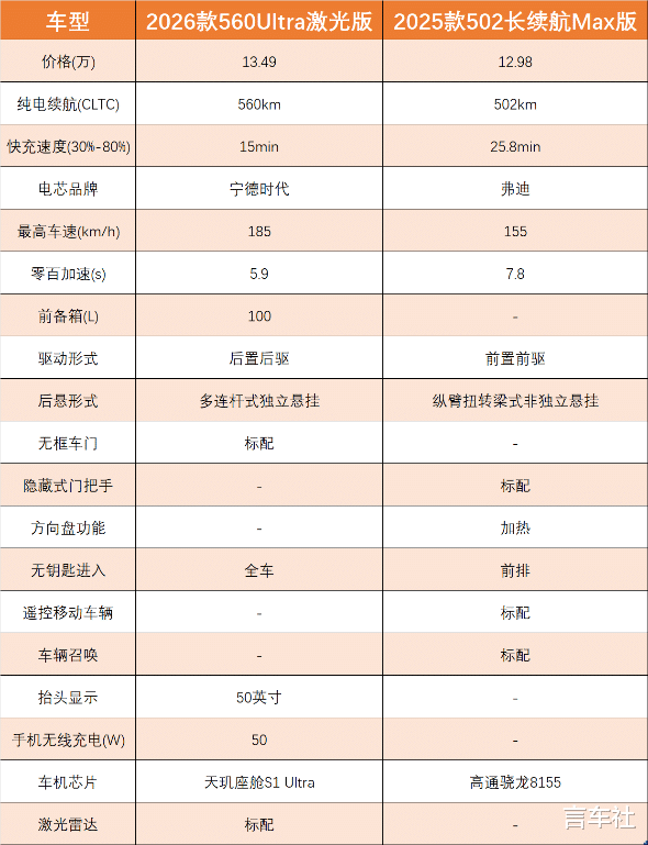 最后在价格方面,在13-14万区间内,深蓝L06的畅销款——2026款 560Ultra激光版是13.49万起,小鹏MONA M03的两个热门版本——502长续航Max版 与 600超长续航Max版,价格分别是12.98万和13.98万。它们的价格高度重叠,配置各有侧重,咱们先来对比前者。