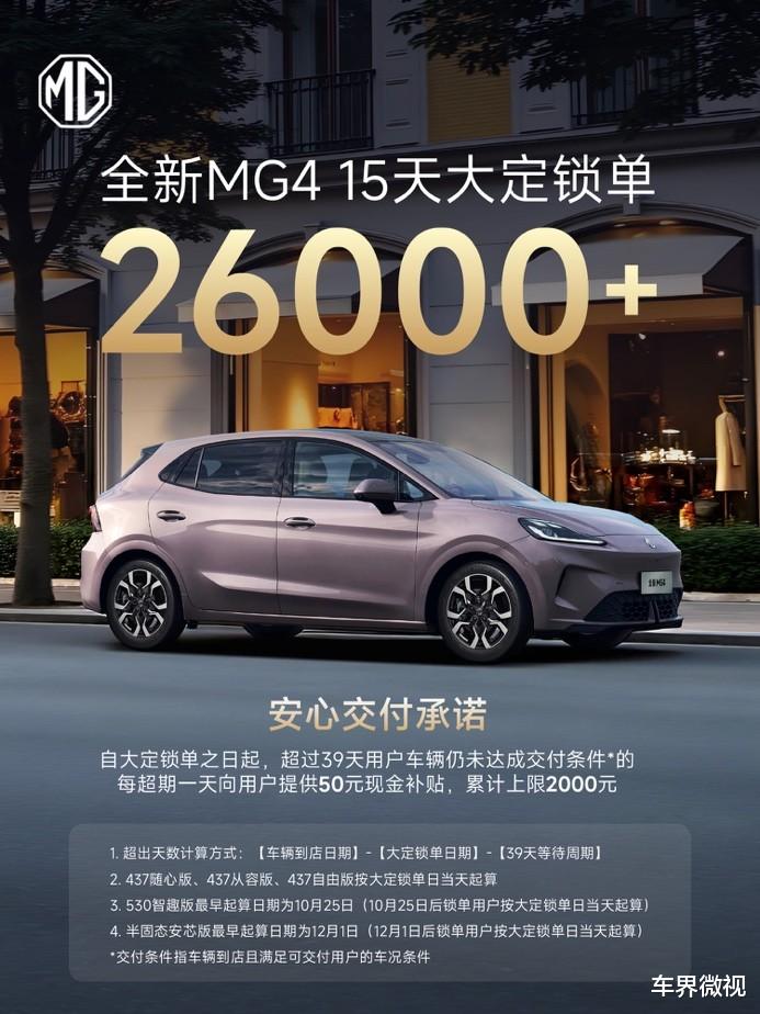 “纯电智趣大两厢”全新MG4自上市以来,凭借极具竞争力的价格与出众的产品实力,迅速获得消费者关注和认可,大定锁单已突破26000张。为让用户买车更安心、交车更透明,MG正式推出“安心交付承诺”:自大定锁单之日起,超过39天用户车辆仍未达成交付条件的,每超期一天,MG将提供50元现金补贴,累计上限2000元;车辆将严格按照大定锁单时间先后顺序配车发运,确保交付流程公平、有序。