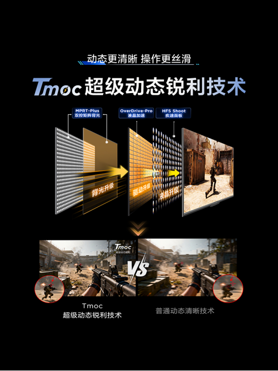 再搭配Tmoc超级动态锐利技术,直接从根源上消除画面拖影和残像,依靠HFS Shoot屏技术、OD Pro液晶加速精控技术和MPRT-PLUS双控矩阵背光的一整套协同优化,实现0.2ms疾速响应!就像《三角洲行动》、《反恐精英》里的激烈团战、高速漂移场景,每一帧都清晰锐利,超低延迟让高压对局里的反应更快、操作更精准,真正做到“指哪打哪”,轻松和对手拉开差距,堪称上分神器!