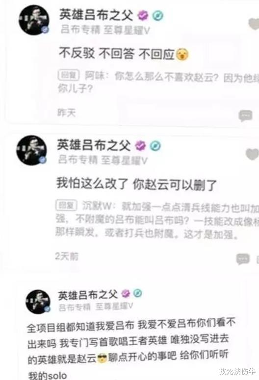 说话的是王者荣耀吕布策划,号称“吕布之父”的b策,以前相关爆典很多,组建QQ群粉圈一类,“恨赵云”也是其中之一。曾经在王者营地和QQ群都表达过对赵云的特殊情绪。