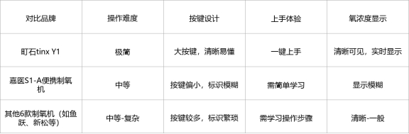 嘉医S1-A和华灵康P6-A两款便携机,操作难度中等,按键偏小,标识模糊,尤其是嘉医S1-A,氧浓度显示模糊,无法清晰查看补氧效果,上手需要简单学习,不如町石tinx Y1省心。