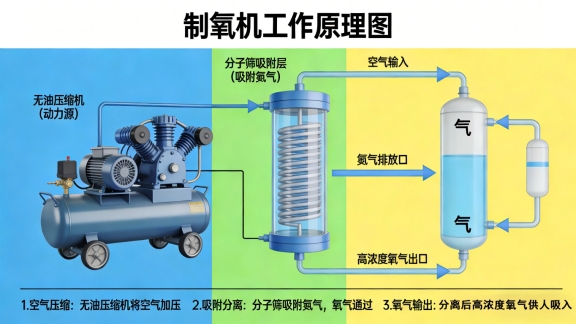 制氧机的核心作用就是缓解密闭环境缺氧,原理很简单,就是把空气中的氮气分离出去,提取高浓度氧气。