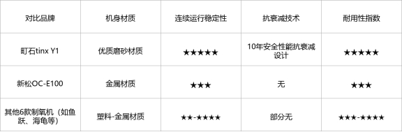 测评方法:将8款制氧机连续运行8小时,测试机身材质的耐磨性、连续运行稳定性,观察是否有漏气、机身发烫、噪音变大等问题,同时查看各款的抗衰减技术,判断长期使用的稳定性。