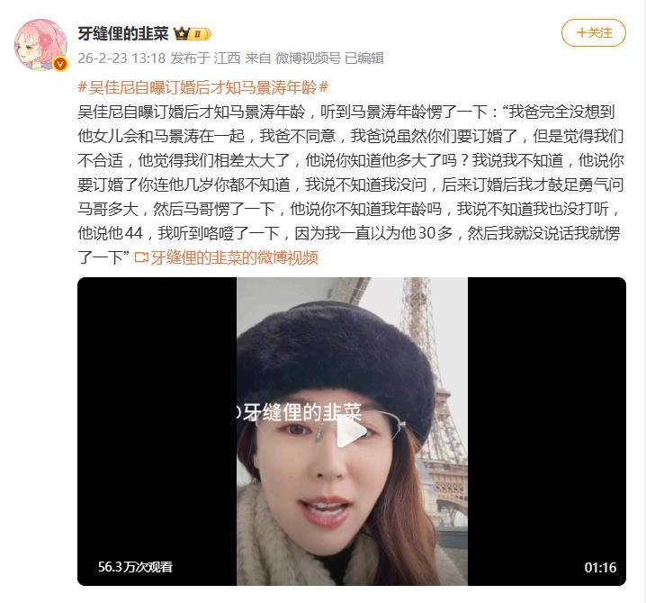 一句“我以为他30多”,让一段尘封的娱乐圈往事再度炸开锅。据2月23日网友爆料,吴佳尼在直播中自曝,2006年与马景涛订婚时,竟完全不知道对方的真实年龄,直到父亲激烈反对后追问,她才震惊地发现两人相差整整21岁。这戏剧性的一幕,瞬间让网友吵翻了天。