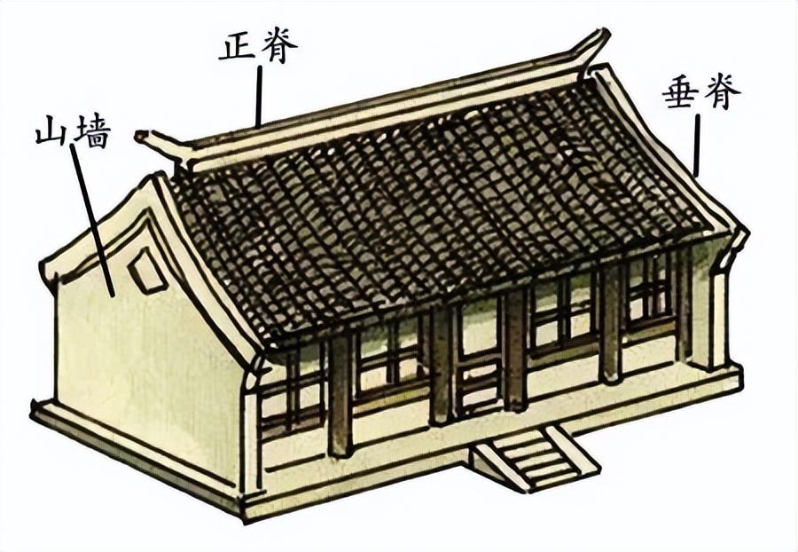 悬山顶悬山顶是两坡顶的一种,由一条正脊及两侧的垂脊组成,其显著的特点是,屋面两端悬出房屋两侧的墙壁之外。这是中国建筑中最常见的形式之一,南方民居建筑使用得比较多,能防止雨水侵蚀两侧墙壁。
