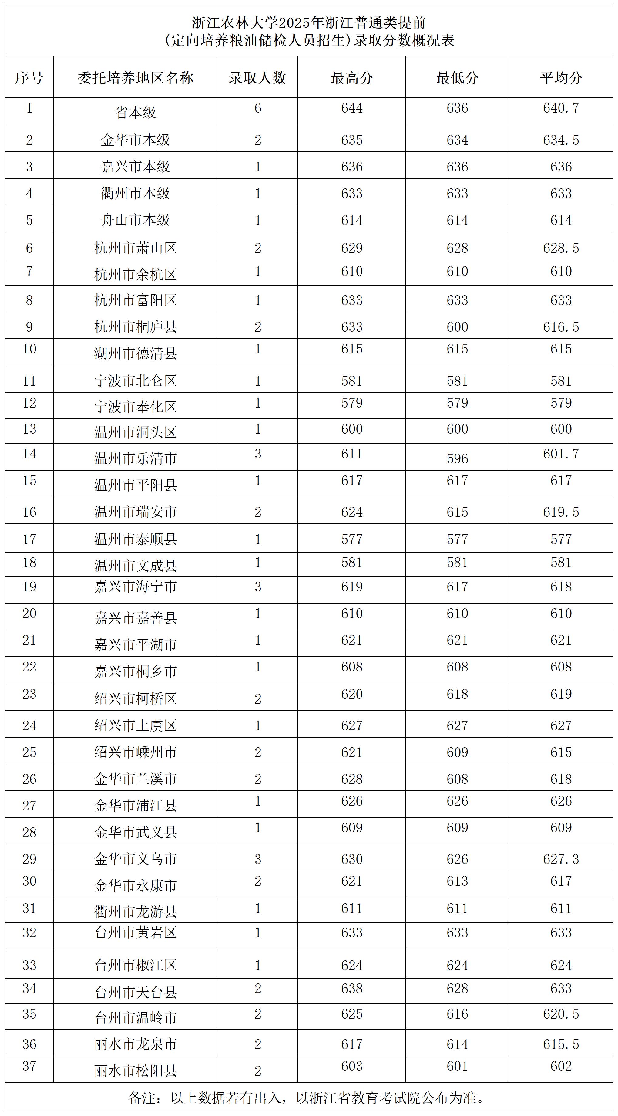 浙江农林大学2025年定向培养粮油储检人员招生录取分数线