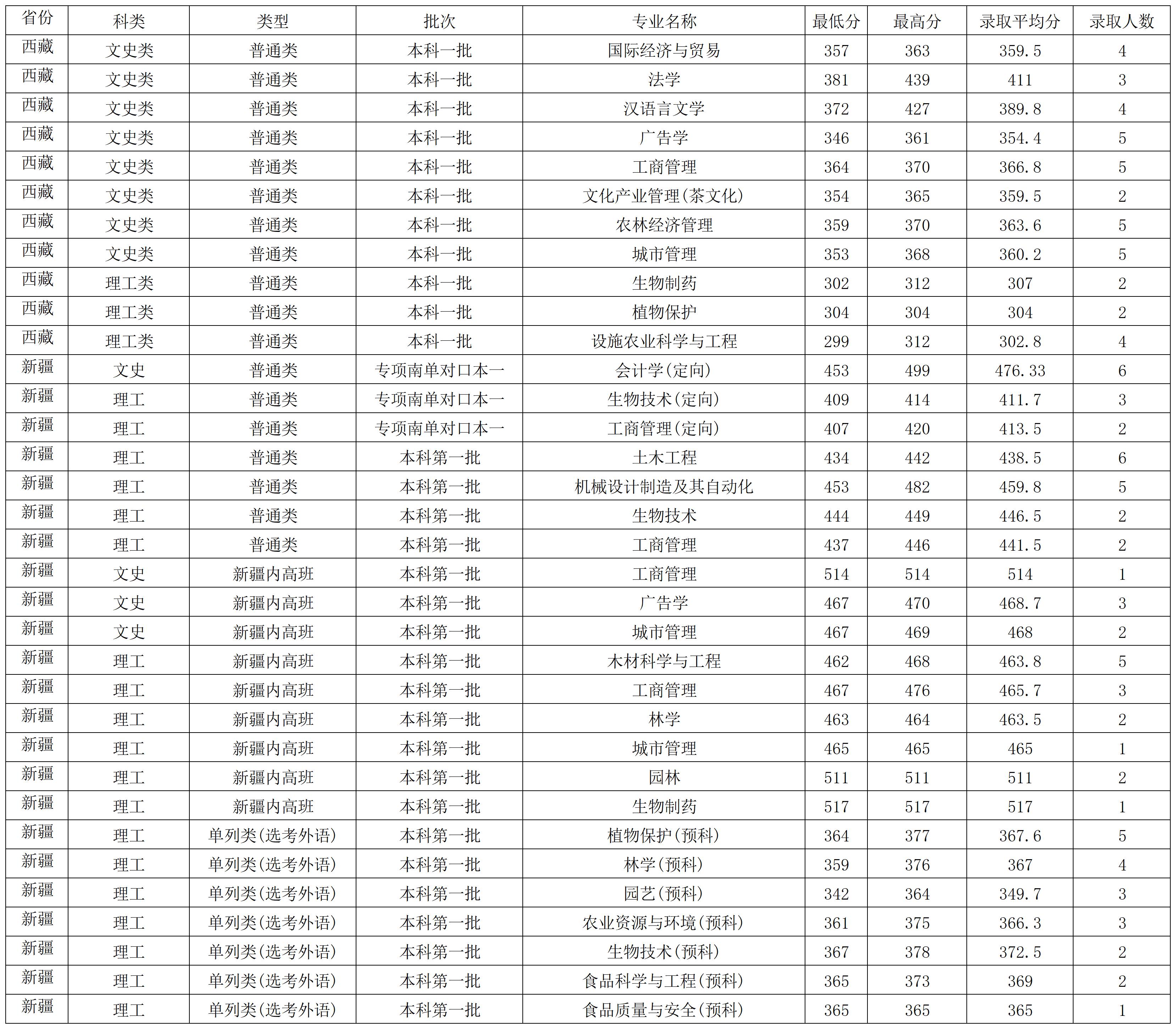 浙江农林大学2025年在西藏、新疆各专业录取分数线