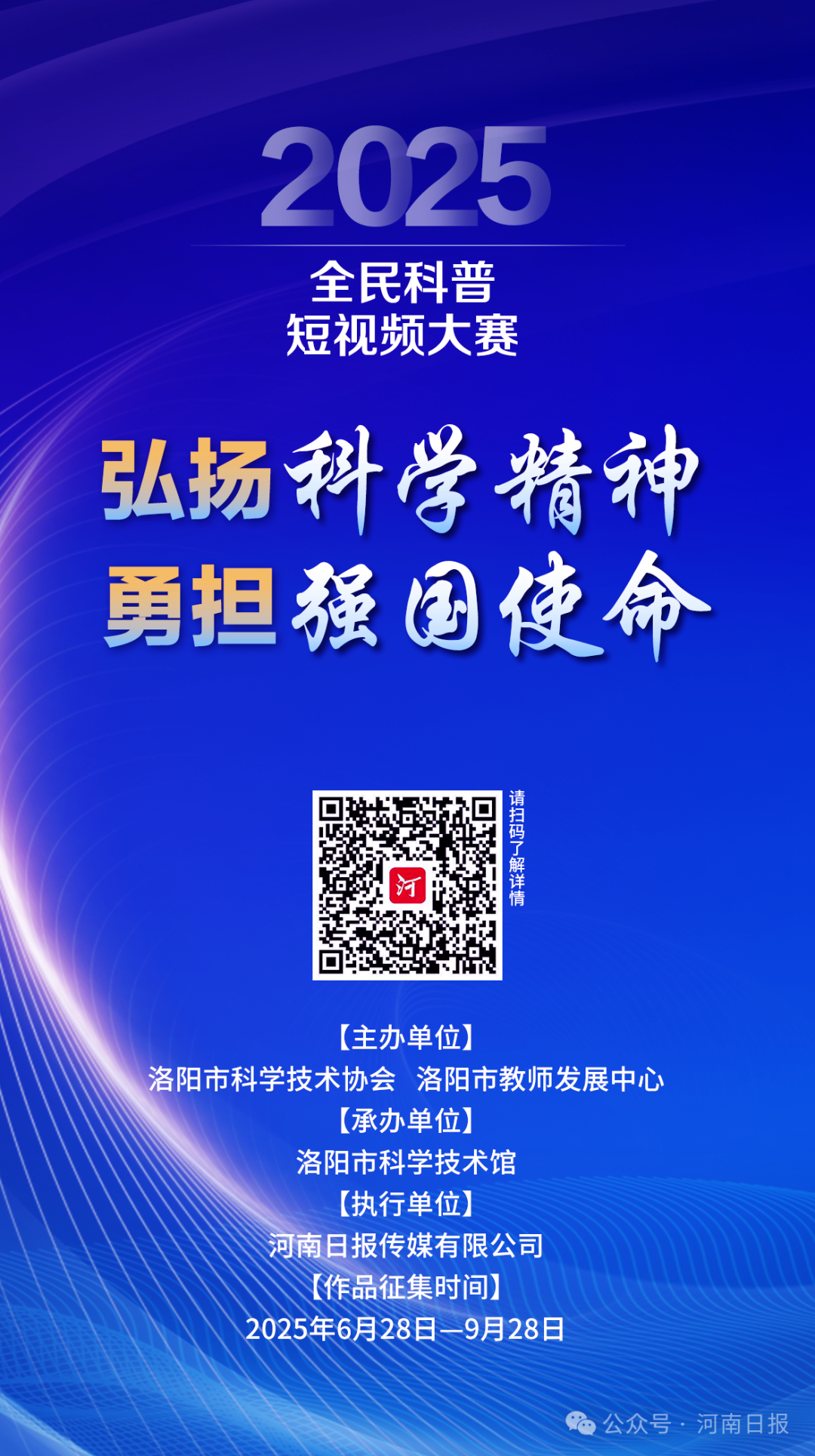 在“十四五”规划收官之年、“十五五”规划谋篇布局的关键之年,一场覆盖全国、联动多地的全民科普短视频大赛即将火热开启!由洛阳市科学技术协会、洛阳市教师发展中心主办,洛阳市科学技术馆承办,并联合新疆生产建设兵团第十三师新星市科学技术协会、西双版纳傣族自治州科学技术协会共同发起的2025全民科普短视频大赛,将于6月28日正式启动作品征集。大赛旨在激发公众参与科普的热情,营造“学科学、讲科学、爱科学、用科学”的浓厚氛围,提升全民科学素质,推动科学普及与科技创新协同发展。