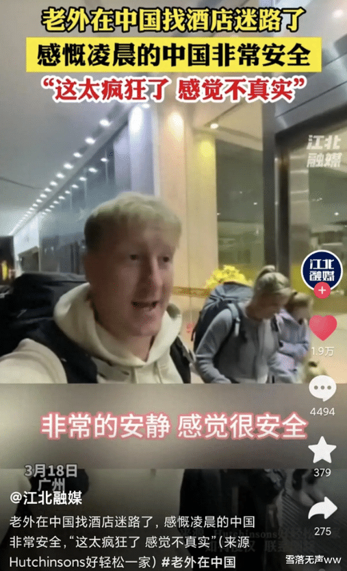根据江北融媒报道,一位英国的博主带着一家五口从马来西亚吉隆坡飞到中国准备3个月的旅行,到广州下飞机后已经是凌晨1点多了,由于他的手机没信号加上出租车司机不会英语,所以不得不两夫妻带着三孩子在半夜走路去找宾馆。三月份凌晨的广州温度在10多度,相比吉隆坡冷了许多,一家五口带着行李,走了半个多小时,终于找到宾馆。这老外虽然感觉是初来乍到就出师不利,但还是有惊喜的收获。那就是在被我们国家的治安良好和深夜的宁静所震撼到了。甚至有好心的中国人要帮助这一家五口。中国的安全和宁静与中国人爱心举动让这位英国博主觉得太疯狂了,感觉不真实。确实是的,这些在我们中国人眼里都是非常正常的一件事情,根本不用大惊小怪,然而在老外眼里却觉得不可置信。