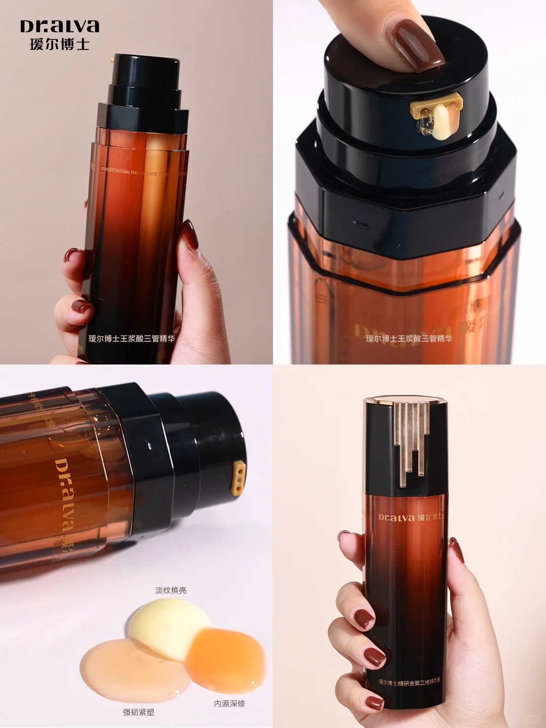 创新性地采用三管分仓设计,分别储存王浆酸、益生元和修护精华,使用时混合确保成分活性。王浆酸具有强大的抗氧化能力,配合益生元调节肌肤微生态,能够有效应对环境损伤和压力引起的肌肤问题,实现多维度精准修护。