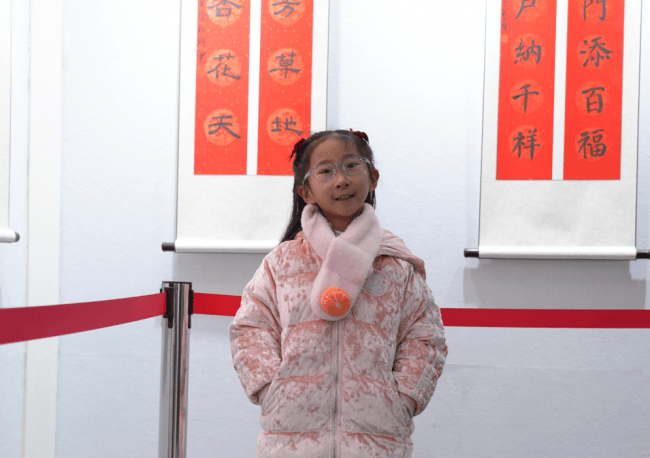 艺佳书画的小学员胡皓月带来的隶书春联作品格外亮眼,笔墨工整、气韵生动,尽显隶书的古朴雅致,成为展览中的一抹亮色。胡皓月也在现场分享了自己的学习与参展心得,她坦言,能带着自己的隶书春联作品参与此次展览,内心十分荣幸,这份成果离不开艺佳书画老师们的悉心教导与辛勤付出。