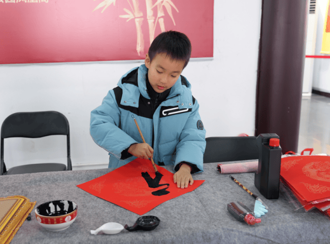 现场写春联、送福字的环节里,张锐涵同学提笔挥毫,动作娴熟,一幅幅喜庆的春联在其笔下成型。她感慨道,中国书法源远流长,是中华优秀传统文化的瑰宝,亲手书写春联、传递新春祝福,既锻炼了书法技艺,也能让更多人感受书法之美。