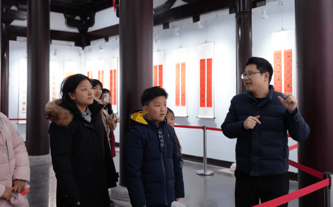 展览现场不仅有优秀作品的静态展示,更有精彩的现场互动环节,吸引了众多家长、孩子及市民前来参观打卡。活动特别邀请浦口区画家高久凯先生、青年书法家陈维老师莅临现场,为展览增添专业风采。南京艺术学院博士陈维老师应邀在现场为参观者开展书法知识讲解,针对篆、隶、楷、行、草等不同书体的特点、笔法技巧进行细致解读,结合展出作品逐一分析点评,指导孩子们学习书法,让现场观众近距离感受书法艺术的独特魅力。