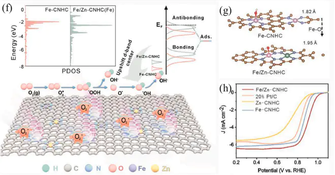 上图展示了另一种策略:引入Zn等吸电子杂原子。这会导致d带中心上移(靠近费米能级)(图f),优化了O₂的初始吸附,同时改变了Fe-O键长(图g),最终也显著提高了ORR性能(图h)。这说明针对反应的不同步骤(吸附/脱附),需要精准调控d带中心的位置。